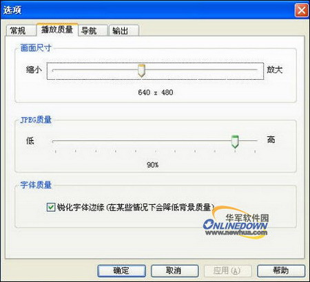 為了使得最終輸出的SWF文件獲得最佳的播放效果,需要對輸出畫面的大小和畫質(zhì)進行設(shè)置。方法:單擊左側(cè)的“選項”按鈕彈出“選項”設(shè)置對話框(圖2)。依次進行“常規(guī)”、“播放質(zhì)量”、“導(dǎo)航”和“輸出”等項設(shè)置。選擇“播放質(zhì)量”選項下,對“畫面尺寸”和“JPEG質(zhì)量”下的滑塊做適當?shù)恼{(diào)節(jié),同時要注意高分辨率高畫質(zhì)的圖片也會帶來體積的增大。