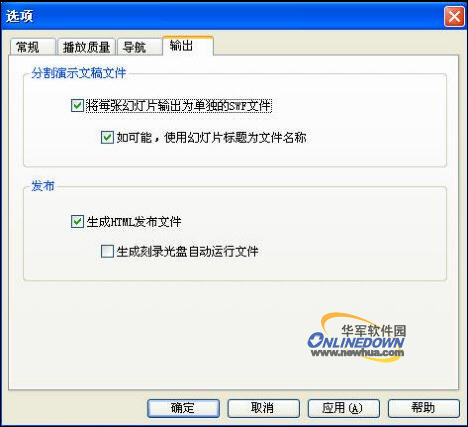 方法同上,在“選項”屬性設(shè)置對話框中,單擊最后一個“輸出”選項。為保證整個輸出文件的完整性,首先要將“分割演示文稿文件”項下的“將每張幻燈片輸出為單獨的SWF文件”前的勾選去掉。此外,如果想讓生成SWF文件的同時一并生成HTML文件進行發(fā)布,那么請將“發(fā)布”項下的“生成HTML發(fā)布文件”項選中即可(圖4)。
