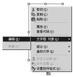 右擊“文字框”,選擇[文字框 對象]→[編輯](如圖4),即可進行文字內容的輸入,或按[Ctrl+V]把剪貼板上的文字拷貝到文字框中。