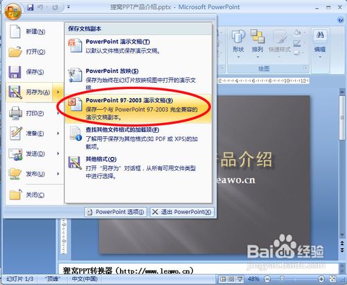 在PowerPoint2007中將PPTX轉(zhuǎn)換成PPT格式