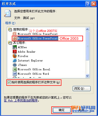 3、此時打開計算機上的“打開方式”選擇“推薦的程序”下面的第二個是Office2003的啟動程序,按確定即可。