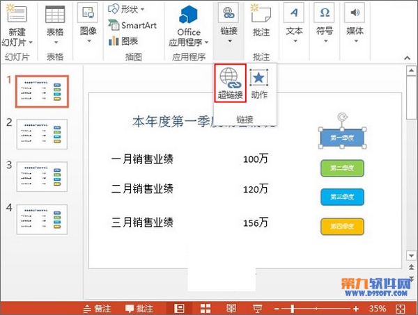 3、新建幾張幻燈片,復制粘貼,修改其中一些數據,得到第一、二、三、四季度的銷售情況。選中代表第一季度的圖形,單擊菜單欄--插入--超鏈接。