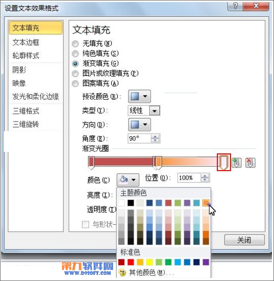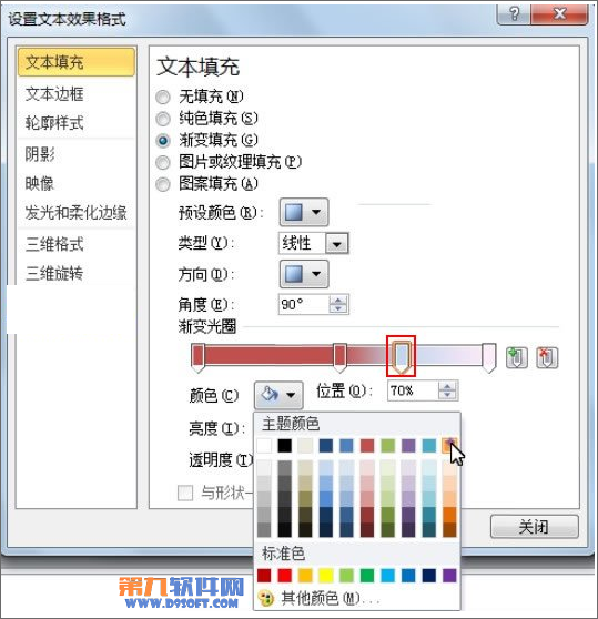 ②彈出設(shè)置文本效果格式對(duì)話(huà)框,在文本填充中勾選漸變填充,預(yù)設(shè)顏色選為雨后天晴這款樣式,如下所示。
