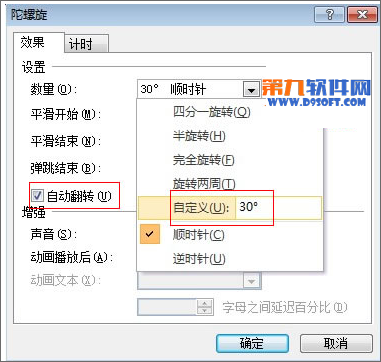 8、設置動作效果,自定義為30度,切記要勾選自動翻轉,否則只會一味的往一邊擺。