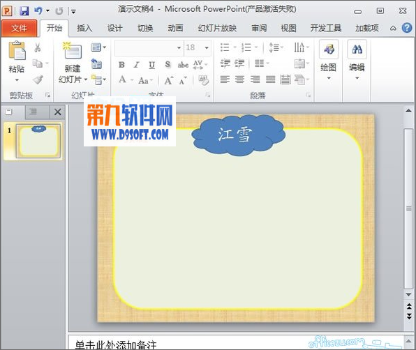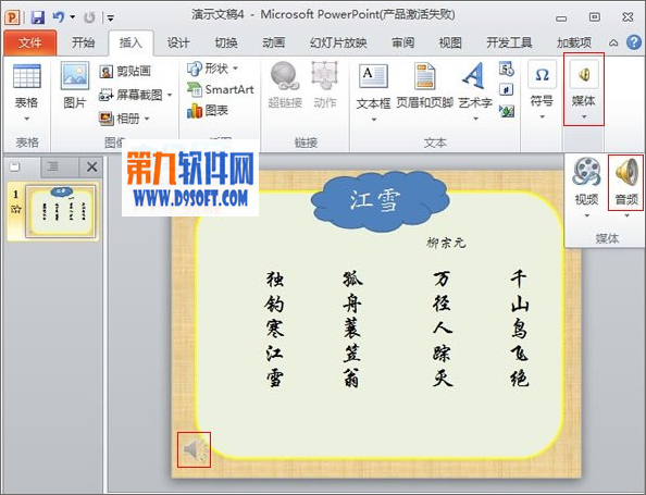 8、如果想讓詩歌更有意境,那么可以添加音頻,選取一首極具意境的音樂當(dāng)做背景聲音。將喇叭按鈕移動(dòng)到幻燈片外部播放的時(shí)候就不會(huì)顯示。