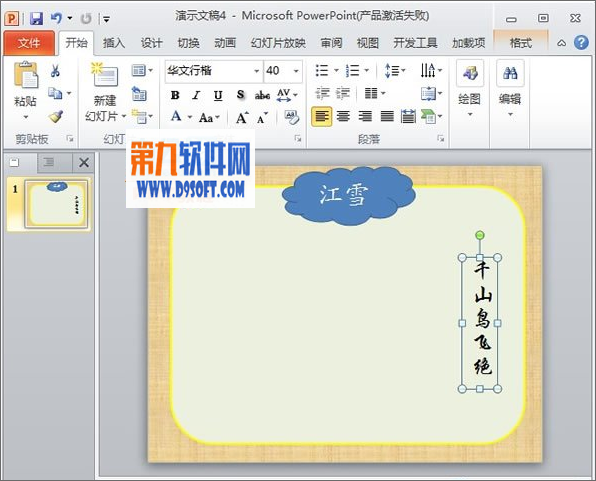 5、點(diǎn)擊菜單欄--插入--文本框--豎直文本框,并在文本框輸入詩句。