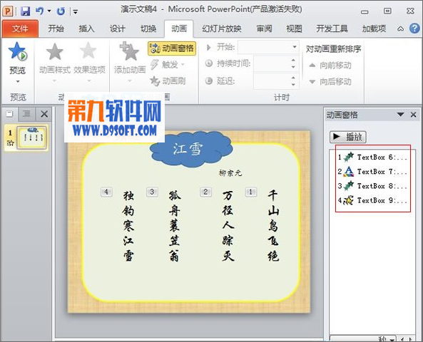 6、選中文本框,按住Ctrl鍵,拖動(dòng),形成4個(gè)文本框,依次修改文本框內(nèi)容,將詩句填寫進(jìn)去。