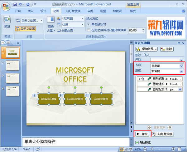 3、在“自定義動畫”窗口中,我們還可以對動畫“方向”、“速度”進行設置,這里我們在“方向”的下拉框中選擇“自底部”選項,在“速度”的下拉框中選擇“非常快”選項。最后我們可以單擊“播放”按鈕觀看幻燈片的效果。提示:不設置“自定義動畫”窗口的“開始”項,則默認選中的多個對象同時執行動作。