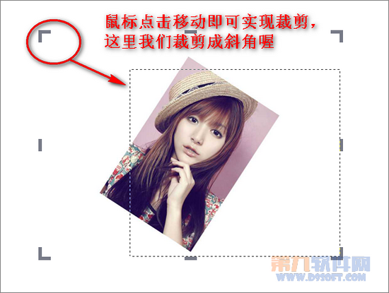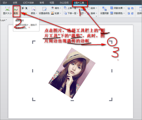 5、點(diǎn)亮圖片,此時(shí)菜單欄會(huì)有一項(xiàng)是“圖片工具”這里我們選項(xiàng)下面的“裁剪”工具,這里圖片會(huì)多了裁剪的邊框,我們只要移動(dòng)邊框即可實(shí)現(xiàn)裁剪,如圖,裁剪成斜角圖片