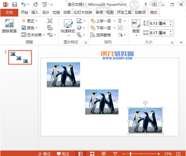 3、圖片插入之后,拖動(dòng)四角小圓圈,可以改變圖片大小,擺放好圖片位置,小編這里復(fù)制了3張,處理之后與處理前進(jìn)行對(duì)比。