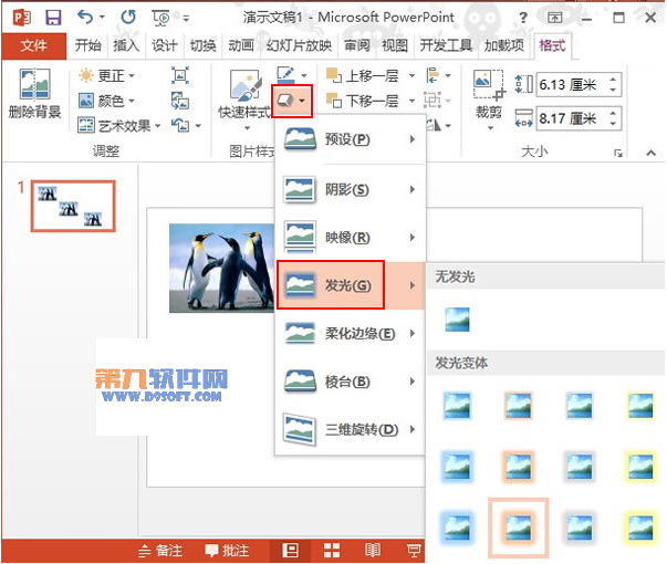 4、選中其中一張圖片,單擊菜單欄--格式--圖片處理--發(fā)光,選擇一種發(fā)光變體。
