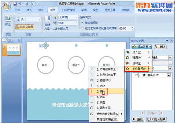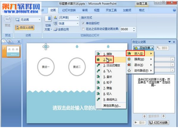 ①首先,我們打開PowerPoint2010,相關的素材我都已經準備好了,單擊水滴圖形,在動畫選項卡中單擊自定義按鈕,這時右側會出現自定義動畫的任務窗格。