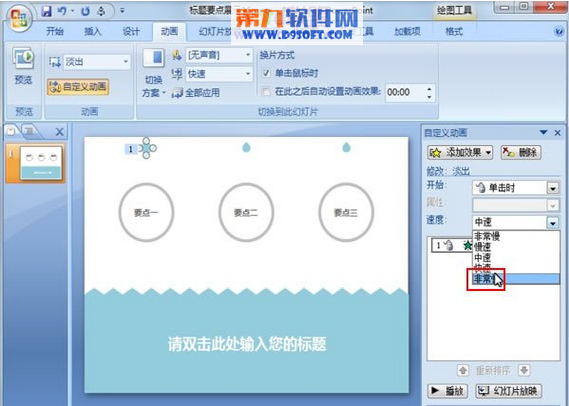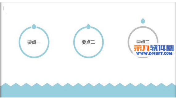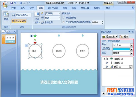 ⑧設置完成,我們播放幻燈片,就能看到水滴下落,與圓圈接觸的同時,圓圈顏色改變為水滴色的效果了。