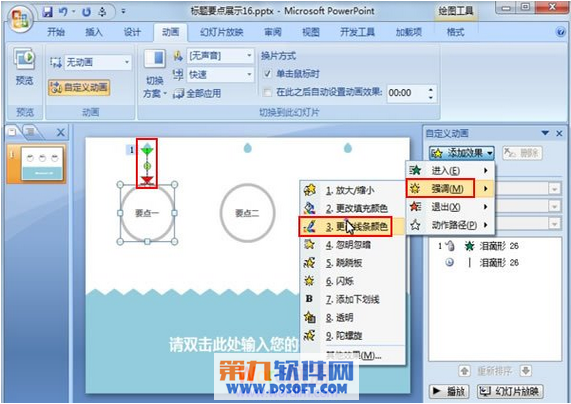 ⑥按住Shift鍵調整動作路徑的長短,然后選中下面的圓圈,添加效果--強調--更改線條顏色。