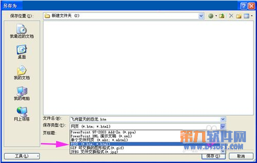 1、打開需要提取的PowerPoint文檔,然后另存為這個(gè)PPT文檔的保存類型為“網(wǎng)頁(*.htm*.html)” :