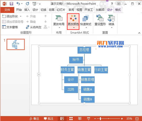 4、如下圖所示,層次關(guān)系更深一步,下面,點擊更改顏色按鈕,修改SmartArt圖形的顏色。
