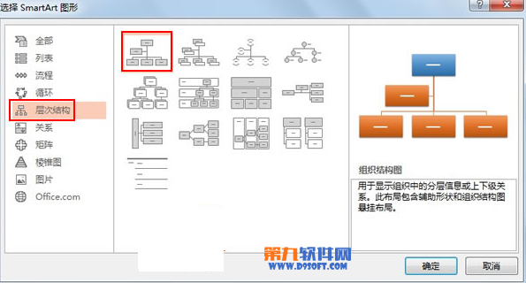 2、彈出SmartArt對話框,我們選擇層次結(jié)構(gòu)標(biāo)簽,選擇第一種樣式,單擊確定。
