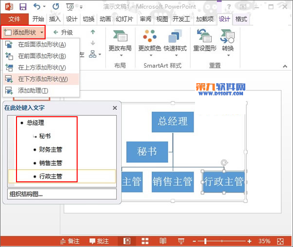 3、SmartArt圖形插入到頁面中,下面進(jìn)行文字的編輯。在左側(cè)方框欄里面輸入名稱,總經(jīng)理、秘書、財務(wù)主管、銷售主管、行政主管。如果這些不足以滿足我們的需要,那么單擊添加形狀按鈕,選擇添加方向。