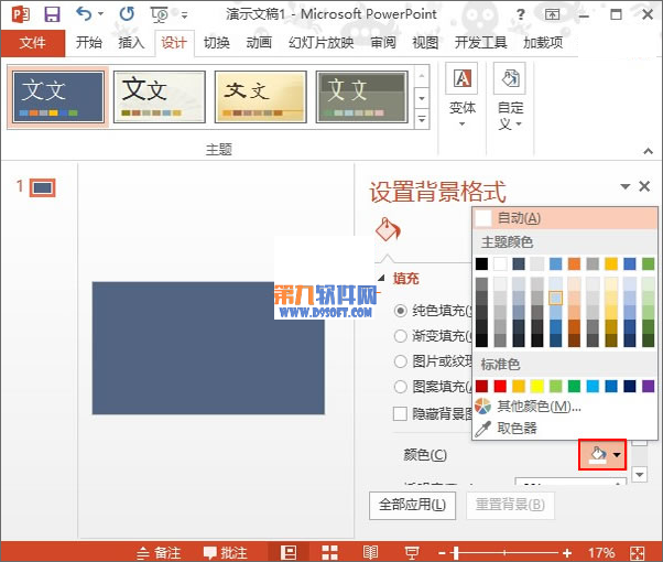 3、右側彈出設置背景格式窗格,勾選純色填充,單擊顏色按鈕,選擇顏色。