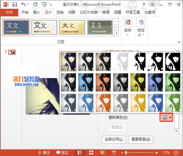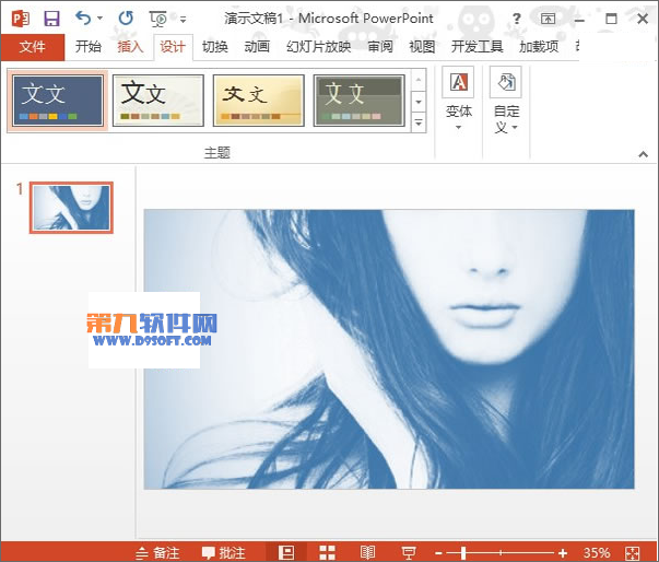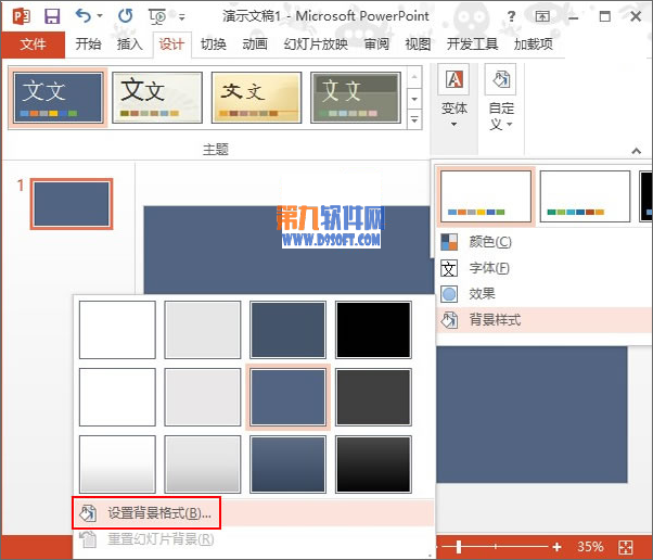 1、我們首先啟動本機上的PowerPoint2013,新建空白幻燈片,單擊菜單欄--設計--變體-背景樣式,選擇一種你喜歡的樣式。