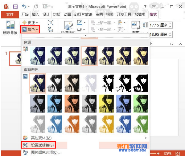 5、Ctrl+C復制,Ctrl+V粘貼到幻燈片頁面當中,選中圖片,調整大小位置,在格式選項卡中單擊顏色按鈕,設置透明色。