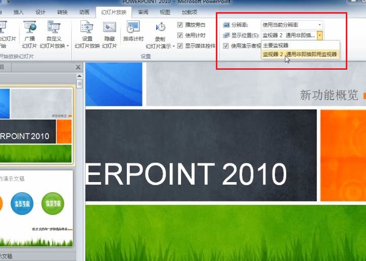 1. 打開 powerpoint 2010,點擊“幻燈片放映”選項卡,在“監視器”選項組中有一個“使用演示者視圖”選項,該選項的作用就是將全屏的幻燈片投射到大屏幕上,而我的計算機不僅能看到幻燈片還能看到備注和計時的信息;