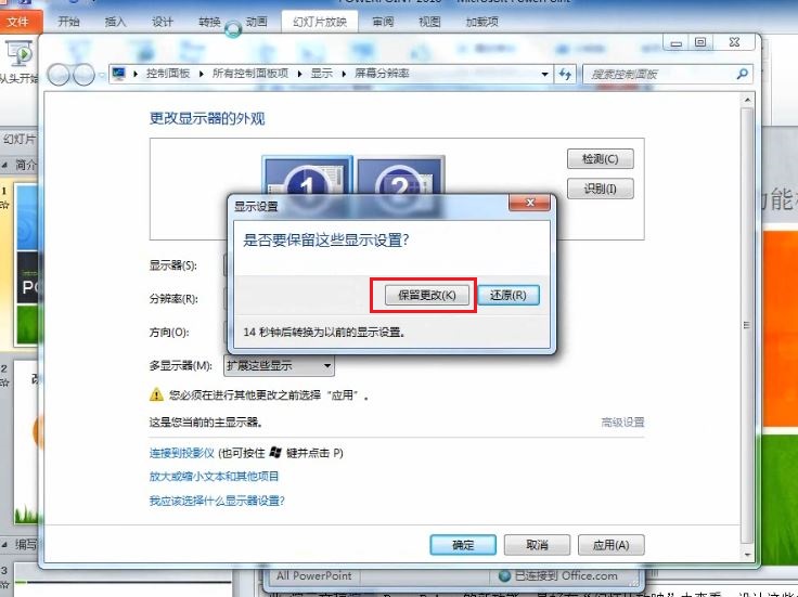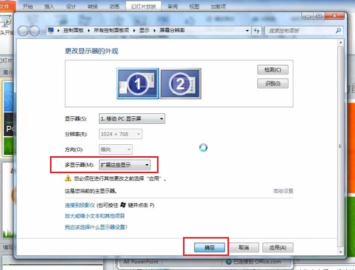 3. 目前已經將計算機連接好了投影儀,可以看到已經出現了兩個監視器,在“顯示器選擇”中選擇“擴展這些顯示”,然后單擊“確定”按鈕;
