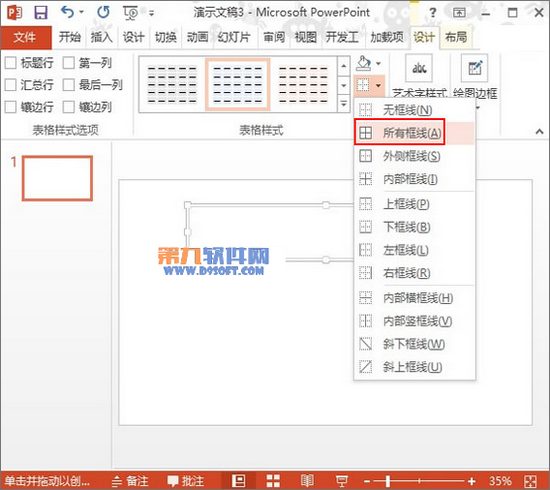 ④在給表格添加框線,單擊框線按鈕,從下拉菜單中選擇所有框線。