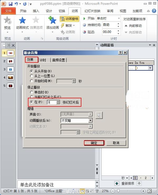 3、切換到【效果】選項卡,將【停止播放】一欄設置為【在3張幻燈片后停止】。設置完畢后單擊【確定】。