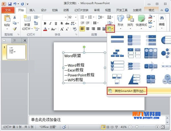 ?、俅蜷_PowerPoint2010,編輯文字,選中文本框,單擊開始菜單里面的轉換為SmartArt圖形按鈕。