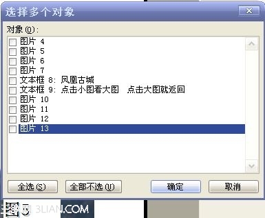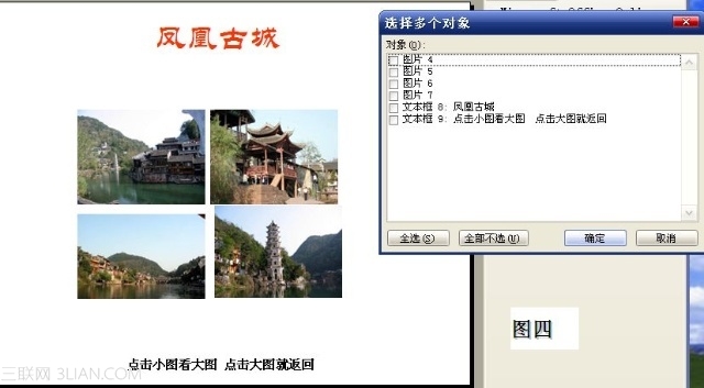 2)按d1 d2 d3 d4的先后順序插入四張大圖,在多個對象界面上,與d1 d2 d3 d4對應的對象即是圖片10、圖片11、圖片12、圖片13.。如圖五: