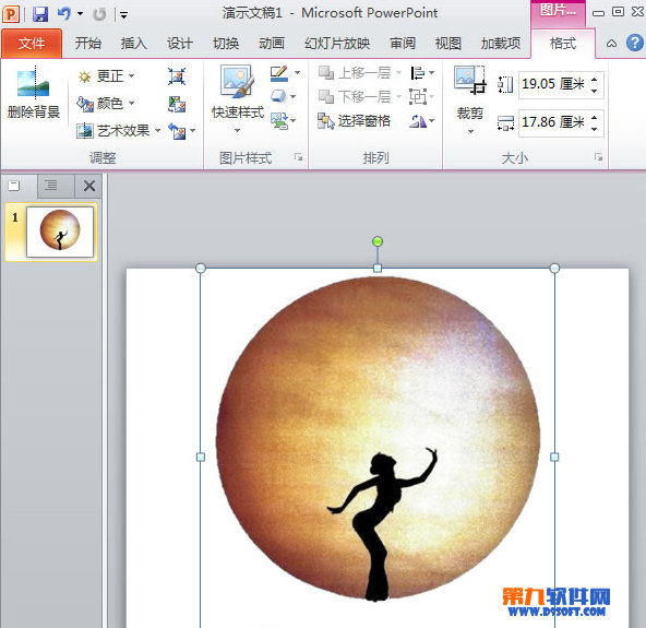 [1] 以下面幻燈片中的圖片為例,我想扣掉圖片中黑色外框部分,但要保留月亮中黑色的人體剪影。首先,鼠標單擊選中圖片,切換到【圖片工具】下的【格式】選項卡,在【調(diào)整】功能組中單擊【刪除背景】按鈕。