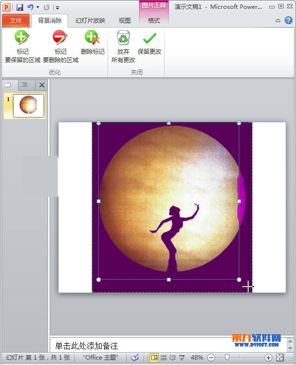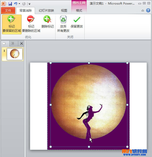 [2] 演示文稿切換到【背景消除】選項卡。如圖紫色區(qū)域是要被刪除的部分。我們先拖動選框四角,將月亮部分框選在保留區(qū)域內(nèi)。