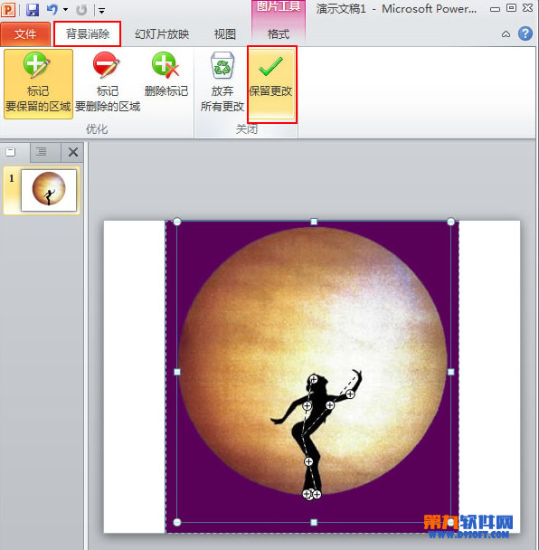 [4] 單擊【背景消除】選項卡下的【保留更改】。看看,是不是保留了我們想要的月亮和人形剪影。