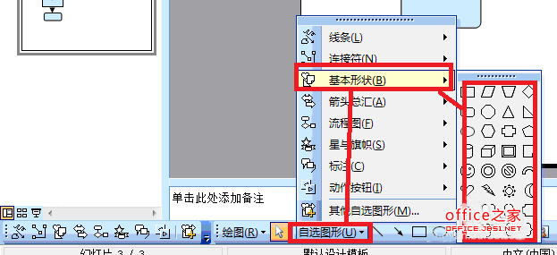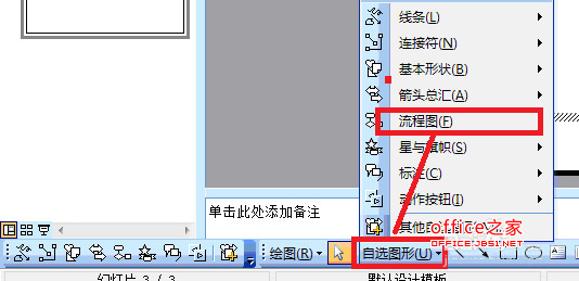 4、我們把繪圖欄打開之后,里面有許多基本的繪圖所需要的圖形。也可以直接選擇流程圖,直接選擇流程圖和我們自己用圖形拼裝起來的流程圖最大的不同就是,選擇流程圖選項之后所做成的流程圖可以進行自我修正。