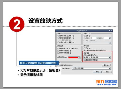 之后還需要在PowrPoint軟件下進行設置,主要是兩點,將幻燈片放映顯示于投影屏幕(監視器2);勾選“顯示演示者視圖”