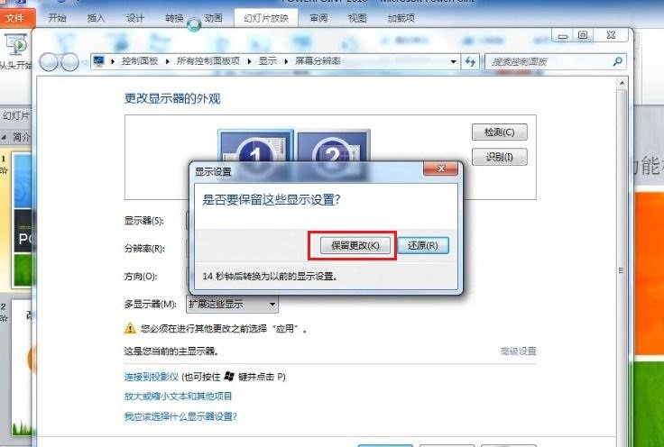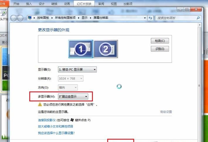 3. 目前已經(jīng)將計算機連接好了投影儀,可以看到已經(jīng)出現(xiàn)了兩個監(jiān)視器,在“顯示器選擇”中選擇“擴展這些顯示”,然后單擊“確定”按鈕;