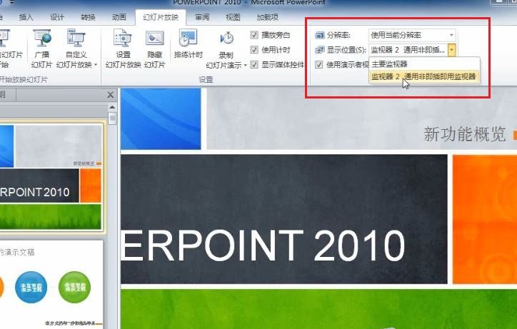1. 打開 PowerPoint 2010,點擊“幻燈片放映”選項卡,在“監(jiān)視器”選項組中有一個“使用演示者視圖”選項,該選項的作用就是將全屏的幻燈片投射到大屏幕上,而我的計算機不僅能看到幻燈片還能看到備注和計時的信息;