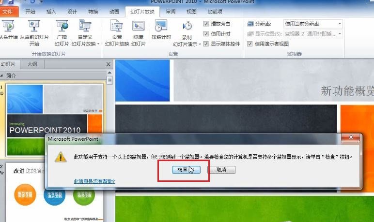 2. 點擊“使用演示者視圖”,此時會出現(xiàn)一個警告信息,該選項實際上告訴我們當(dāng)前的計算機只檢測到了一個監(jiān)視器,而我們要“使用演示者視圖”的話必須有兩個或兩個以上的監(jiān)視器,請確認(rèn)自己的計算機已經(jīng)連好了投影儀或者已經(jīng)連接了其他的監(jiān)視器,現(xiàn)在點擊“檢查”按鈕;