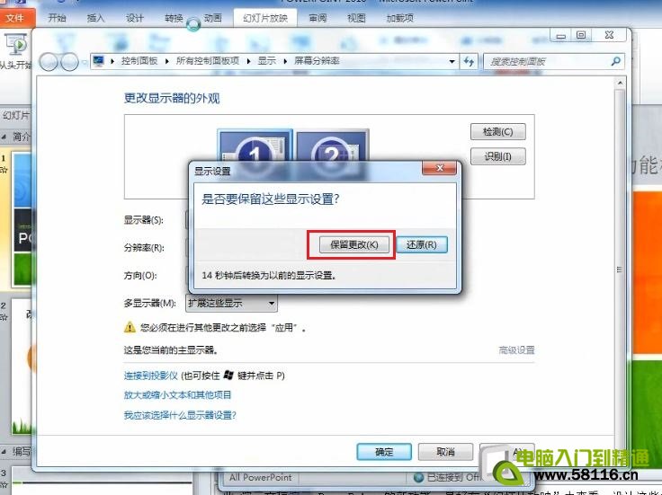 3. 目前已經將計算機連接好了投影儀,可以看到已經出現了兩個監視器,在“顯示器選擇”中選擇“擴展這些顯示”,然后單擊“確定”按鈕;