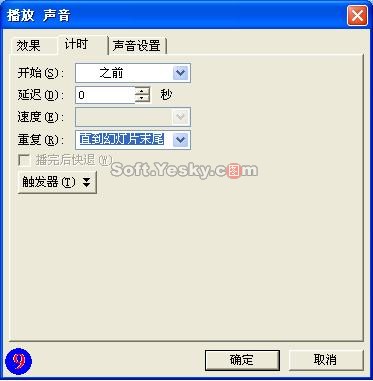 6、再雙擊該動畫方案,打開“播放聲音”對話框(如圖9),切換到“計時”標簽下,按“重復”右側的下拉按鈕,在隨后彈出的下拉菜單中,選擇“直到幻燈片末尾”選項,確定返回。
