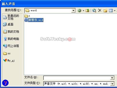 1、執行“插入→影片和聲音→文件中的聲音”命令,打開“插入聲音”對話框(如圖7)。