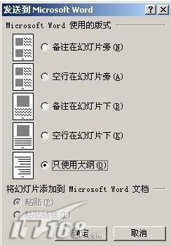 2.完成選擇之后,系統(tǒng)首先會出現(xiàn)“撰寫”對話框,此時應(yīng)當(dāng)在“在Microsoft Word使用的版式”欄中選擇一種版面的配置,然后在“將幻燈片添加到Microsoft Word文檔”欄中選擇將中文PowerPoint的幻燈片轉(zhuǎn)換到中文Word文件時的變化方式。