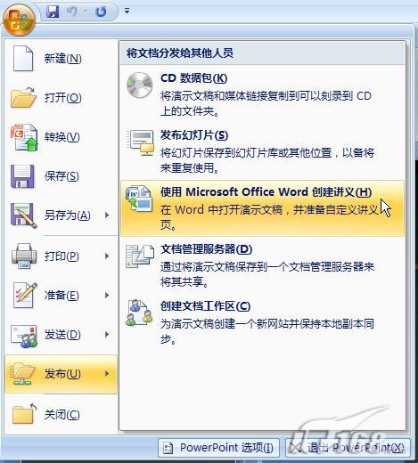 在Microsoft Office PowerPoint 2007版中,這個功能依然沒有得到改善。只是在“發(fā)送”里面卻找不到Microsoft Word命令項了。