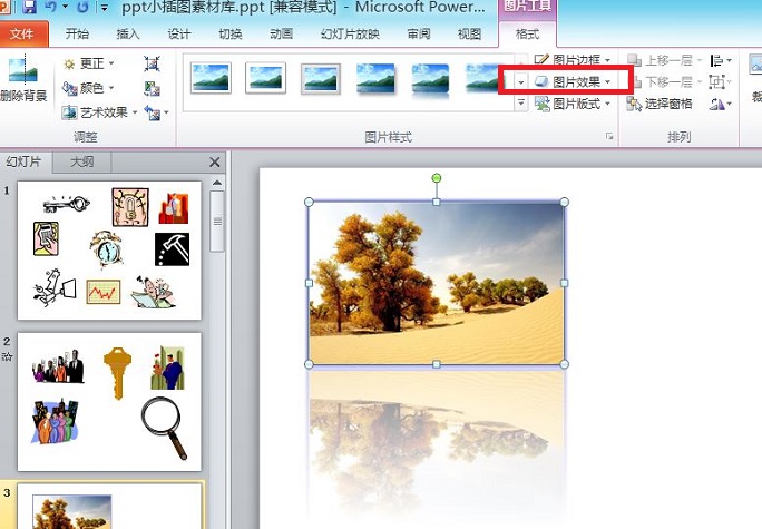 1.打開 PowerPoint 2010,新建一張幻燈片,插入一幅圖片,這里選擇“沙漠”,如圖: