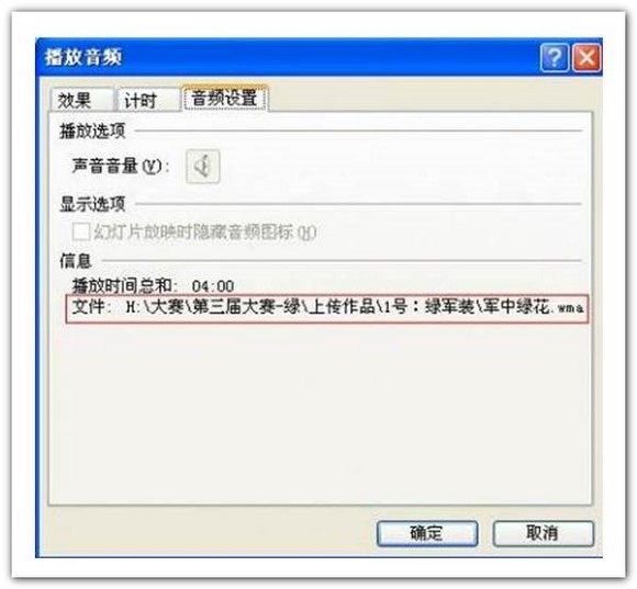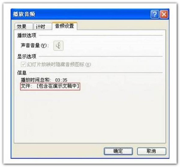 此時要檢查每個插入的聲音文件是否顯示為【文件:包含在演示文件中】(如下圖)。