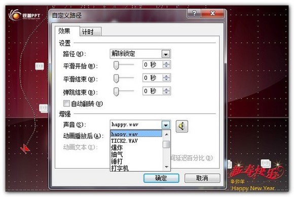 3、當一個對象設置了增強聲音(即通過在動畫屬性里添加聲音),無論是系統自帶還是插入外部聲音,轉成WMV視頻文件后都無聲音。
