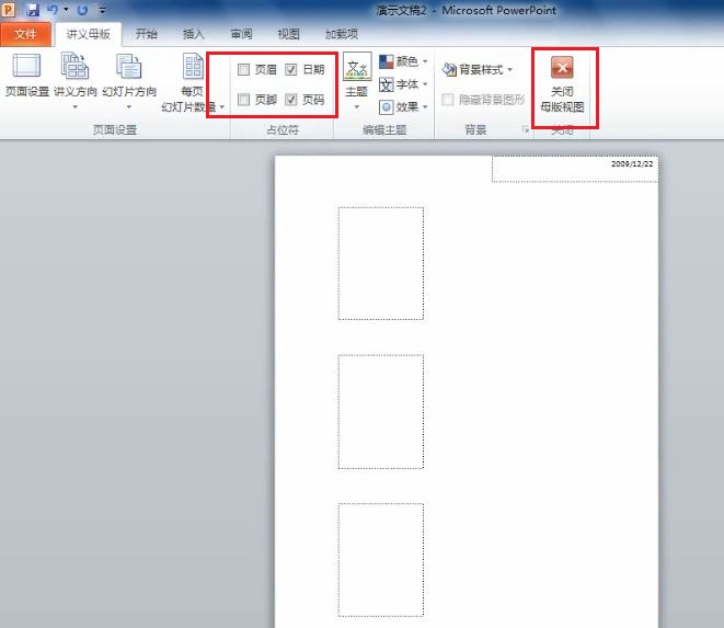 3. 如果需要在幻燈片中打印上“日期”和“頁(yè)碼”請(qǐng)勾選相應(yīng)的小方框,對(duì)于想要打印“日期”的位置也可以進(jìn)行相應(yīng)的調(diào)整,調(diào)整完畢后請(qǐng)選擇“關(guān)閉母版視圖”,如圖3: