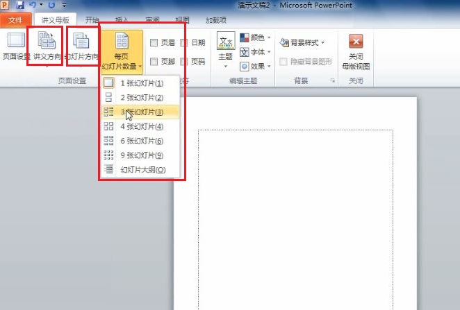 2. 在此可以設(shè)置母板的樣式,如“幻燈片方向”、“講義方向”、“每頁(yè)幻燈片的數(shù)量”等,這里面我們?cè)O(shè)置“講義方向”為縱向,“幻燈片方向”為縱向、“每頁(yè)幻燈片的數(shù)量”為3張幻燈片,如圖2: