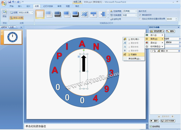 6、選中時針,選擇“自定義動畫”,添加“動作效果”為:強調(diào)-->陀螺旋。